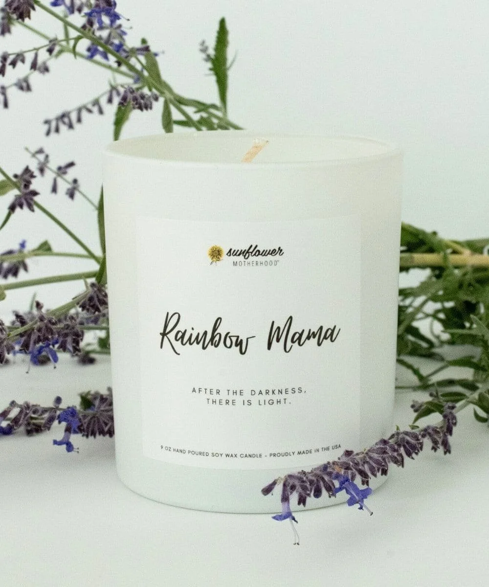 Rainbow baby is a term used to refer to a baby born after the parents have suffered from a miscarriage, stillbirth or infant loss. It symbolizes light after a deeply painful time. Our Rainbow Mama candle is meant to honor the loss while celebrating the rainbow baby; holding two truths at once. We hope it brings strength and love to the mother in her current pregnancy or postpartum period. It's made with our customer-fave herbal lavender smell that helps soothe and calm.