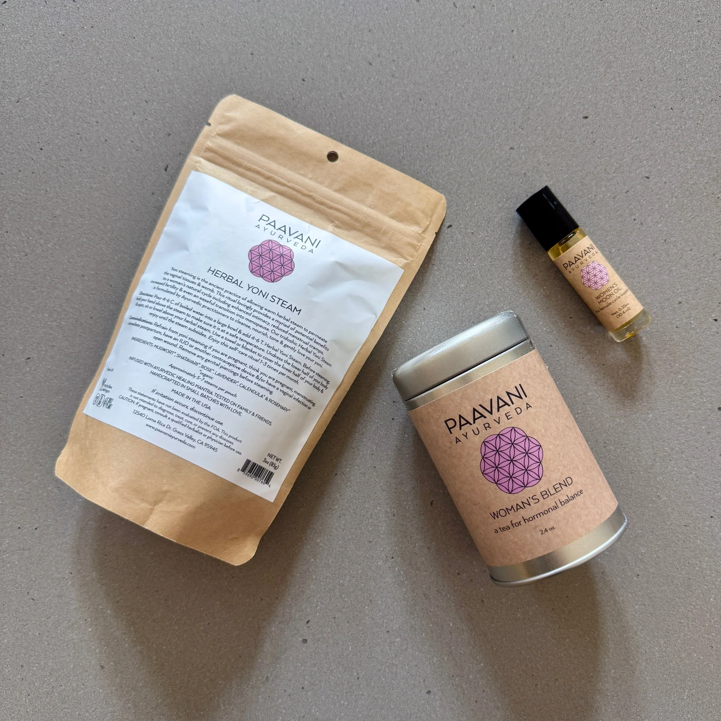 This intentional collection includes our Herbal Yoni Steam, thoughtfully crafted to cleanse, tone & energetically care for your womb space; Women’s Blend Tea, a hormone-balancing, hydrating loose-leaf herbal infusion & Women’s Moon Oil, a topical blend designed to soothe & support your body through your cycles & seasons.